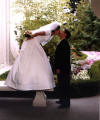 the sweat peas and rose we think Jeanie knit this sweater she is wearing in front of her high school in Moraga, California, where she was a cheerleader a couple of years ago. (photo by Carrie). right, Jeanie at her sister, Diane's wedding, November, 2000. |